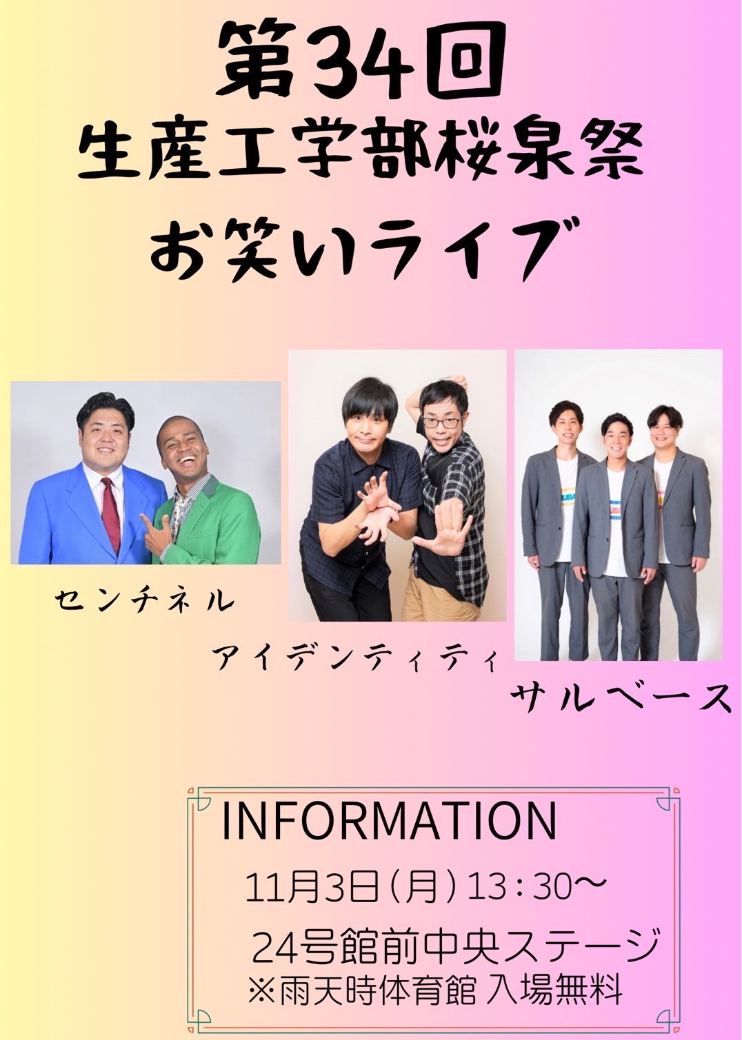 今年もお笑いLIVE2025を開催いたします! ゲストは 「アイデンティティ」さん!「センチネル」さん!「サルベース」さん! 3組にネタを披露して頂きます。 日時: 11月3日(月)13:30∼場所: 晴天時 24号館前(中央ステージ) 雨天時 25号館2階 体育館内ぜひお越しください!
